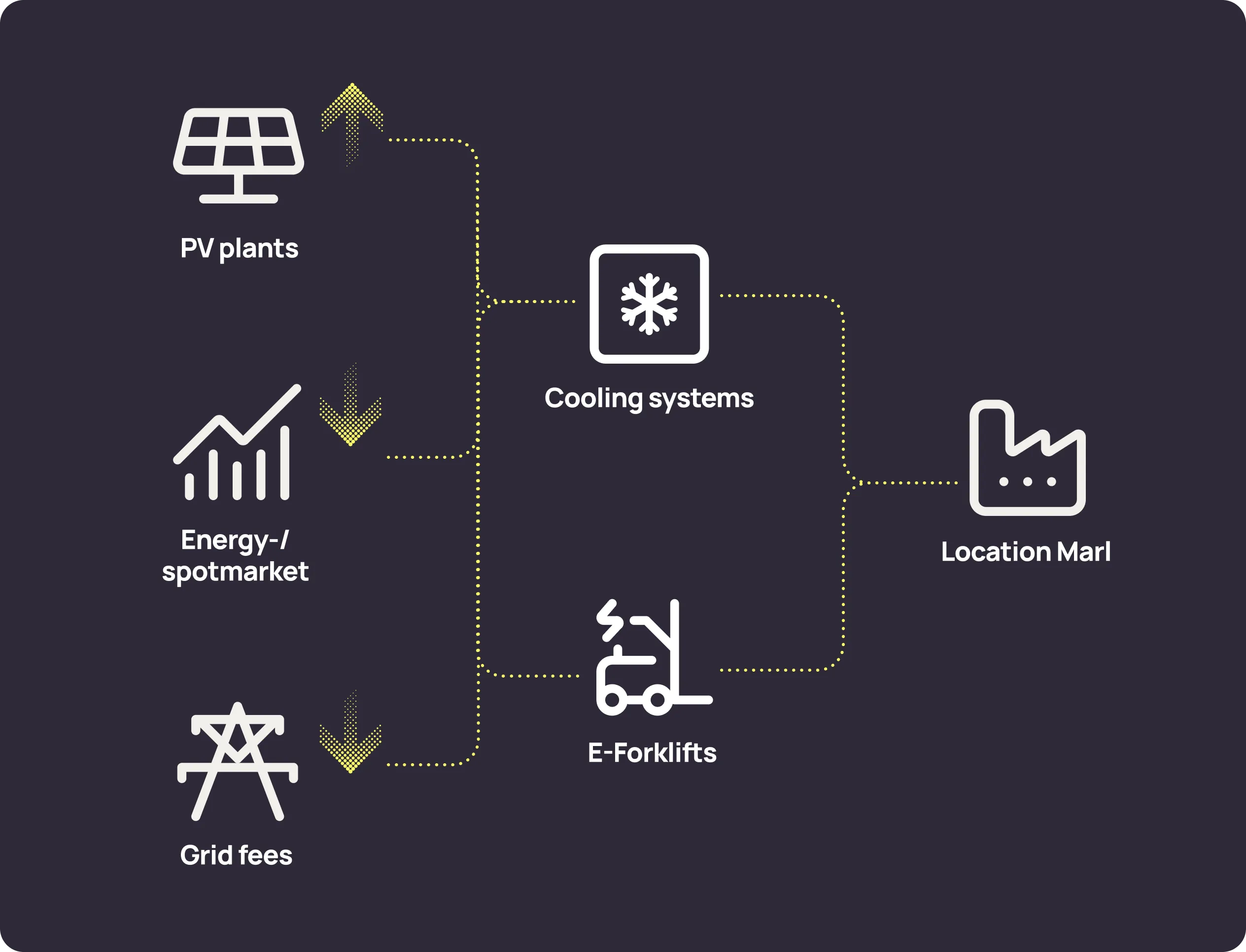 The numerous cooling systems and peak loads led to high energy costs. At the same time, the PV electricity generated on site was not being used in a targeted manner.