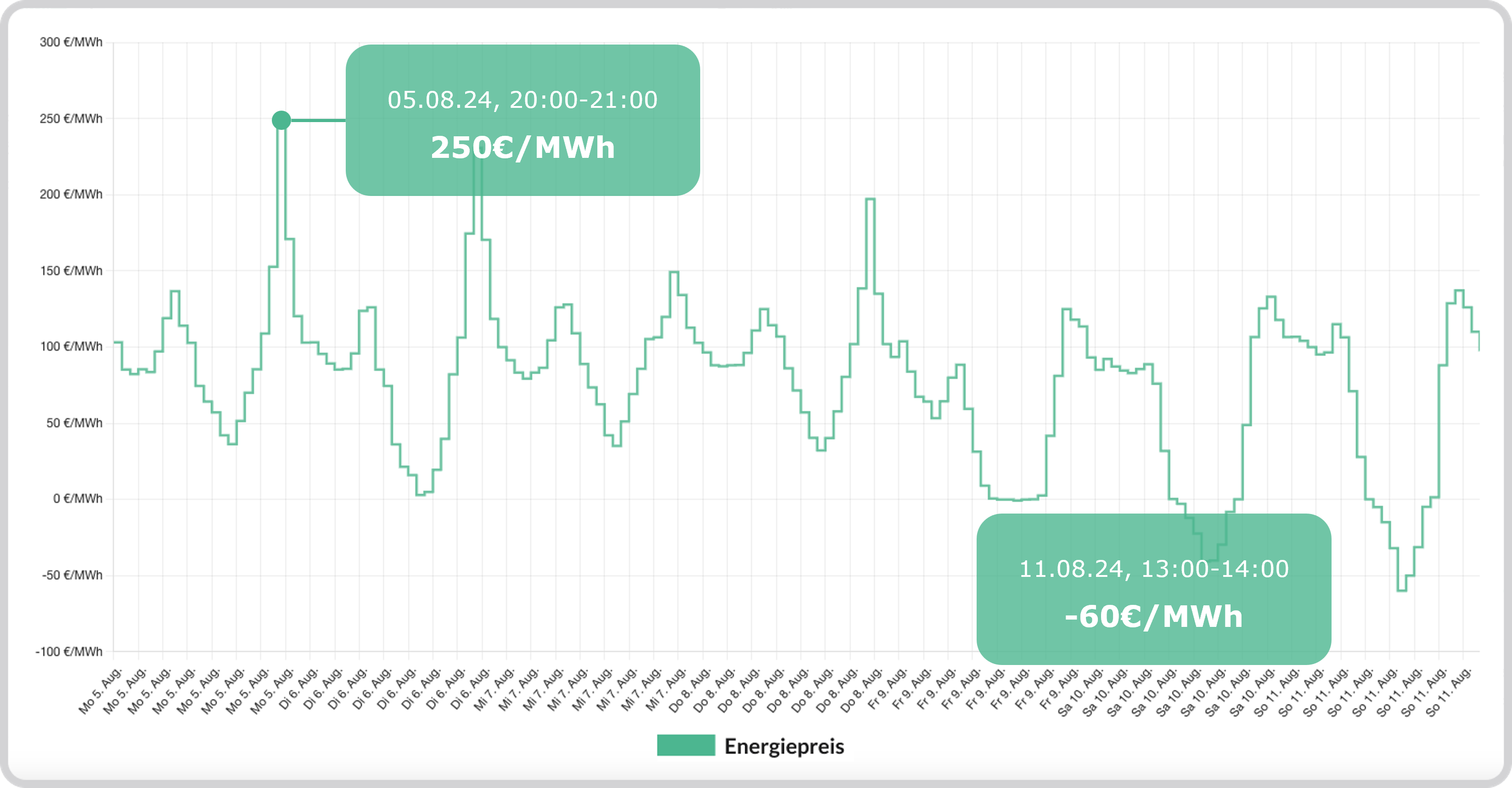 Die Energiewende geht voran und Photovoltaik und Windkraft werden immer weiter ausgebaut. Damit steigen auch die wetterbedingten Schwankungen, also die Volatilität, im Stromangebot. Sonnenstunden und Windphasen entscheiden immer stärker über Verfügbarkeit und Preis. Im Sommer 2024 schwankten die Strompreise am Spotmarkt in Deutschland innerhalb einer normalen Woche zwischen +250 €/MWh und -60 €/MWh. Wer in den teuren Zeitfenstern weniger Strom verbrauchte, konnte massiv Kosten sparen.